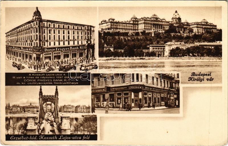 Budapest, Királyi vár, Dörge Frigyes Bank Rt. reklám, Erszébet híd, Ko... https://www.darabanth.com/de/448-Fernauktion/448.0/Ansichtskarten/Ungarn~1500013/Budapest-Kiralyi-var-Dorge-Frigyes-Bank-Rt-reklam-Erszebet-hid-Kossuth-Lajos-utca-EK~II2171574