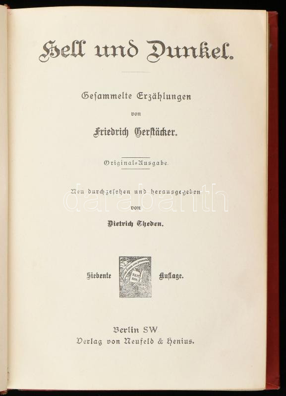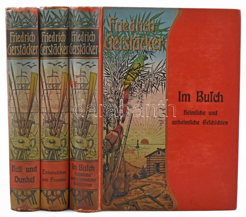 Friedrich Gerstäcker 3 könyve: Im Busch. Australische Erzählung. Heimliche und unheimliche Geschichten; Einheimisches und Fremdes; Hell und Dunkel. Gesammelte Erzählungen. Friedrich Gerstäckers Werke. Berlin, é.n., Neufeld & Genius. Német nyelven. Kiadói illusztrált, festett egészvászon sorozatkötésben, nagyrészt jó állapotban, a borítókon némi kopással.