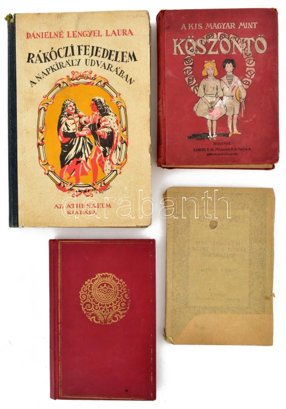 4 db régi könyv: Alföldi András: Magyarország népei és a Római Birodalom. Kincsestár 42. sz. Bp., 1934, Magyar Szemle Társaság. Kiadói papírkötés, kissé sérült borítóval. + Móricz Zsigmond: Házasságtörés. Bp., 1923, Athenaeum. Fáy Dezső rajzaival. Kiadói aranyozott egészvászon-kötés, kissé kopott borítóval. + A kis magyar mint köszöntő. Magyar köszöntők és levelek. Összeáll.: Bácsi József. Bp., [1903], Lampel R. (Wodianer F. és Fiai). Harmadik kiadás. Kiadói illusztrált, festett egészvászon-kötés, kissé kopottas, foltos borítóval. + Dánielné Lengyel Laura: Rákóczi fejedelem a Napkirály udvarában. Bp., é.n., Athenaeum. A borító és a rajzok Fáy Dezső munkái. Kiadói illusztrált félvászon-kötés, kissé sérült borítóval és gerinccel.