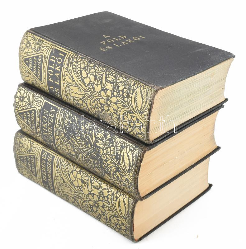 A Pesti Hírlap Könyvtára, 3 kötet: A Pesti Hírlap Lexikona. A mindennapi élet és az összes ismeretek kézikönyve egy kötetben A-Z.; A Föld és lakói.; Az ezeréves Magyarország. Bp., 1937-1939, Pesti Hírlap (Légrády-ny.) Gazdag képanyaggal illusztrálva, térképekkel. Kiadói aranyozott egészvászon-kötés, nagyrészt jó állapotban, a borítókon némi kopással.