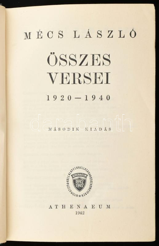 Mécs László összes versei 1920-1940. Bp., 1942, Athenaeum, 760 p. Második kiadás. Kiadói félvászon-kötés, a gerincen kis sérüléssel, a hátsó borítón kis folttal. Mécs László (1895-1978) premontrei szerzetes, költő által aláírt példány!