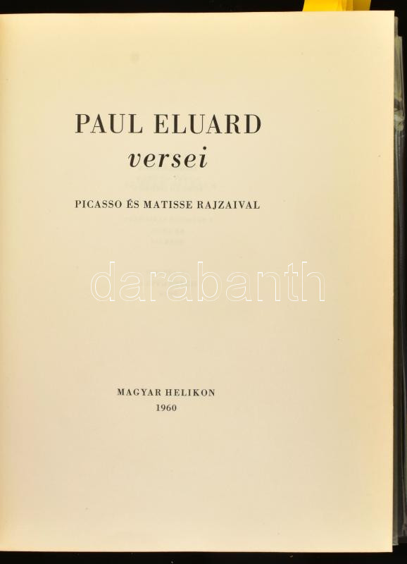 Paul Eluard versei. Picasso és Matisse rajzaival. Fordította: Illyés Gyula, Rónay György, Somlyó György. A bevezető tanulmány Aragon munkája. Az utószót Illyés Gyula írta. Válogatta: Somlyó György. Bp., 1960, Magyar Helikon, 346+2 p. Kiadói félbőr-kötés, kissé hiányos műanyag védőfóliában. Számozott (361./600) példány.
