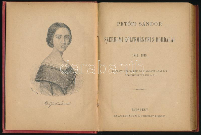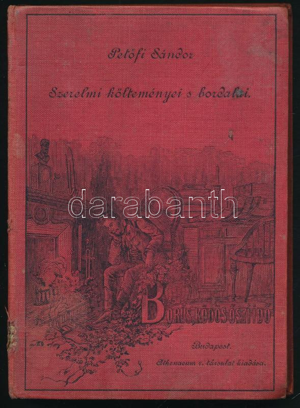 Petőfi Sándor szerelmi költeményei s bordalai 1842-1849. Eredeti kéziratok és kiadások alapján szerkesztett kiadás. Bp., 1890, Athenaeum, 242 p. A címképen Pollák Zsigmond Petőfi Sándornét ábrázoló metszetével. Kiadói illusztrált, festett egészvászon-kötés, Gottermayer-kötés, a gerincen kis sérülésekkel, enyhén foltos borítóval, belül nagyrészt jó állapotban.