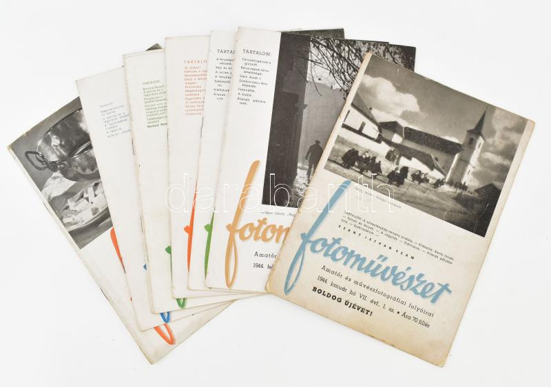 1944 Fotoművészet. Amatőr és művészfotográfiai folyóirat. 8 db szám: VII. évf. 1-3., 6., 8-11. sz., 1944. január-november. Fekete-fehér fotókkal, hirdetésekkel. Tűzött papírkötés, vegyes állapotban.