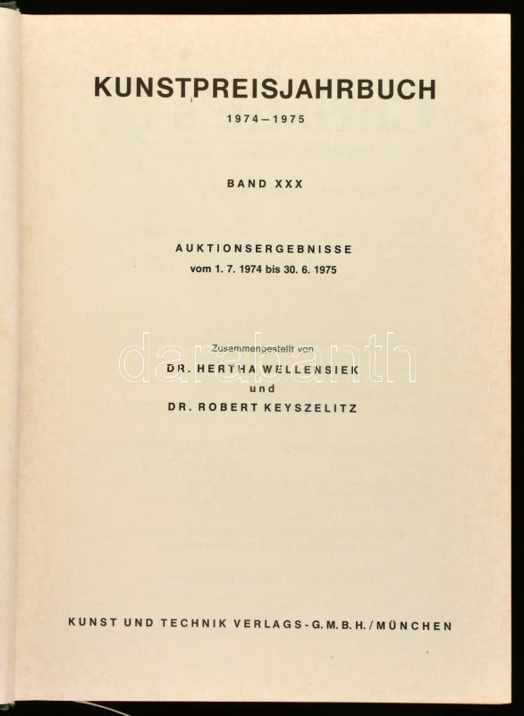 Kunstpreisjahrbuch 1974-1975. Band XXX. Zusammengestellt von Dr. Hertha Wellensiek und Dr. Robert Keyszelitz. (Műtárgykatalógus és árjegyzék). München, 1975, Kunst und Technik Verlags-GmbH. Fekete-fehér fotókkal illusztrálva. Német nyelven. Kiadói egészvászon-kötés.