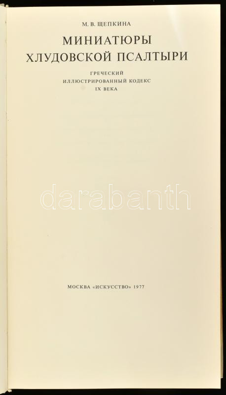 M.V. Schepkina: Miniatures of the Khludov Psalter. Illustrated Greek codex of the 9th century. Moszkva, 1977, Iskusstvo. Orosz és görög nyelven. Angol nyelvű rezümével. Gazdag képanyaggal illusztrált fakszimile kiadás. Kiadói egészvászon-kötés, kiadói papír védőborítóban.