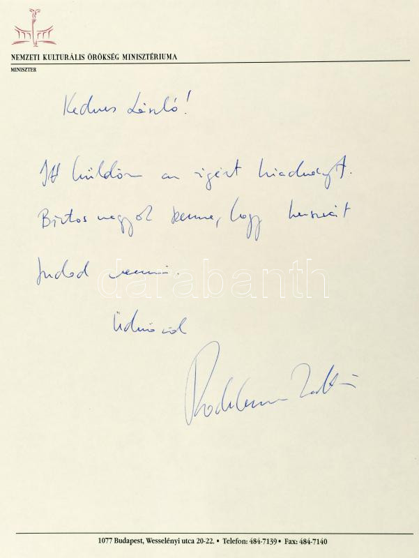 Beschreibung: The "Sacco di Budapest" and depredation of Hungary 1938-1949. Works of art missing from Hungary as a result of the second world war. Szerk.: Mravik, László. Bp., 1998., Magyar Nemzeti Galéria. Gazdag képanyaggal illusztrált. Angol nyelven. Kiadói papÃrkötésben, a gerincen cÃmkével, jó állapotban. Benne Pokorni Zoltán (1962-) oktatási miniszter ajándékozási soraival, aláÃrásával a Nemzeti Kulturális Örökség Minisztériuma fejléces papÃron.