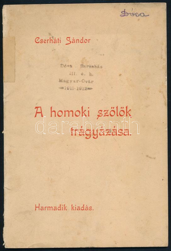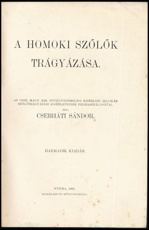 Cserháti Sándor: A homoki szőlők trágyázása. Nyitra, 1906, Huszár Istv... https://www.darabanth.com/de/448-Fernauktion/448.0/Bucher/Bucher-Gastronomie-und-Gartnerei~2000014/Cserhati-Sandor-A-homoki-szolok-tragyazasa-Nyitra-1906-Huszar-Istvan-47-p-Harmadik-ki~II2965206