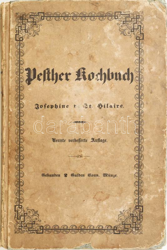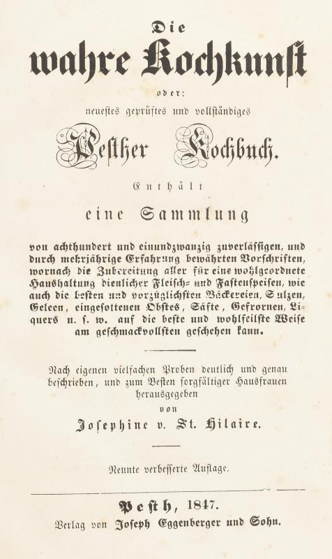 St. Hilaire, Josephine von: Die wahre Kochkunst, oder: neuester geprüftes und vollständiges Pester Kochbuch. [A főzés igaz művészete, avagy a legújabb Pesti Szakácskönyv]. Pesth, 1847, Eggenberger, (Trattner-Károlyi-ny.),4+545 p. Neunte verbesserte Auflage. Német nyelven. Kiadói kartonált papírkötés, kopott, kissé foltos borítóval, foltos lapokkal, a lapok kötése a 16. oldalig laza, sérült, egy lap kijár (17/18.), hiányzó szennylapokkal.