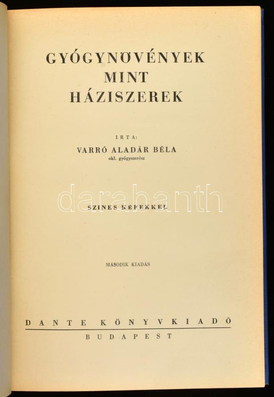 Varró Aladár Béla: Gyógynövények mint háziszerek. Bp., 1931, Dante. Második kiadás. Színes képekkel illusztrált. Kiadói egészvászon kötésben, jó állapotban.