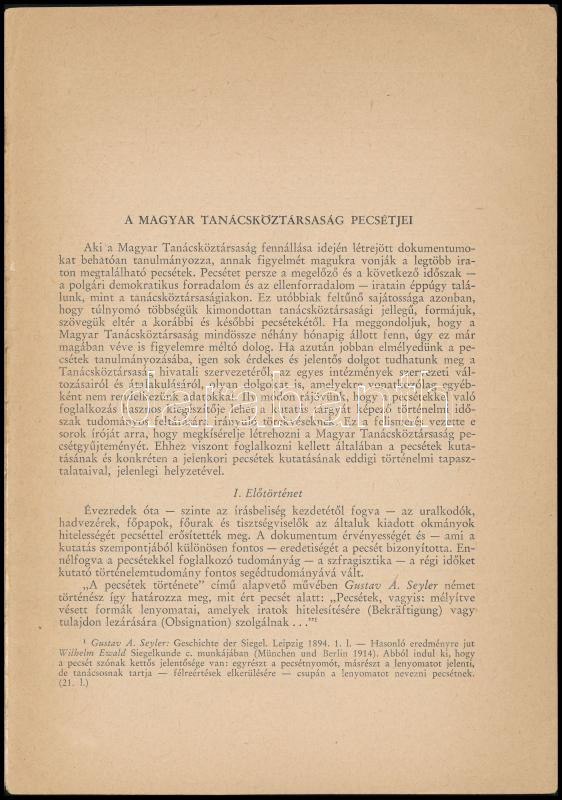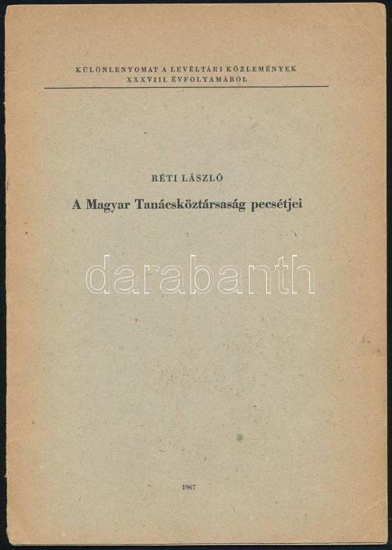 Régi László: A Magyar Tanácsköztársaság pecsétjei. Különlenyomat a Levéltári Közlemények XXXVIII. évfolyamából. H.n., 1967, (Szegedi Ny.), 173-191 p. + 8 (fekete-fehér képek) t. Kiadói papírkötés, sérült borítóval és fűzéssel, kijáró lapokkal.