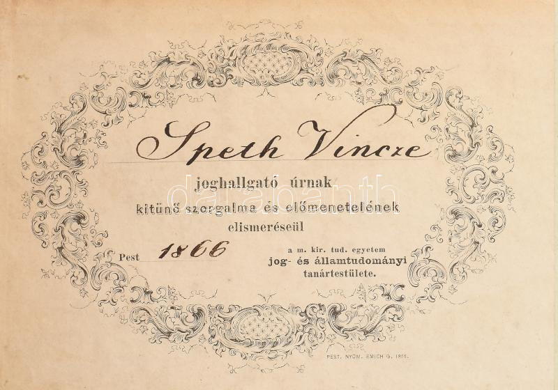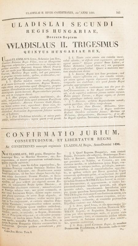 Corpus decretorum juris hungarici. Decretum generale inclyti regni Hungariae partiumque eidem adnexarum. I. köt. Tomus Primus, continens opus tripartitum juris consvetudinarii ejusdem regni, auctore Stephano de Werbőcz ac decreta, constitutiones et articulos serenissimorum et apostolicorum regum ac inclytorum statuum et ordinum regni Hungariae partiumque eidem annexarum a Sancto Stephano usque ad Ferdinandum III. inclusive in publicus eorundem comitiis conclusos et editos. Budae, 1844, Typis et Sumptibus Typographiae Reg. Universitatis Hungaricae, 2 sztl. lev.+XII + 834 p. A címlapon koronás magyar nagycímerrel. Latin nyelven. Korabeli félbőr-kötésben, kopott borítóval, tulajdonosi névjegzéssel, foltos lapokkal, restaurált. Speth Vince joghallgató részére szóló 1866-os egyetemi ajándékozási címkével.