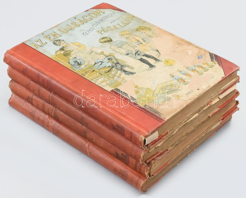 1896-99 Az én újságom. Képes gyermeklap 4 db fél évfolyama szórványban. Szerk.: Pósa Lajos. 1896. (VII. évf.) második félév, 1897 / 1, 1898/1., 1899/2. féleévek. Bp., Singer és Wolfner (Hungária-ny.), Számos illusztrációval. Kiadói félvászon-kötésben,kissé kopottas, foltos borítóval, néhány lap széle sérült, két kötés laza