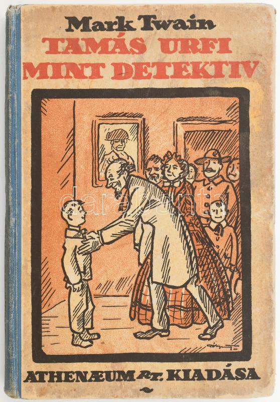 Twain, Mark: Tamás urfi mint detektiv. Elbeszéli Huck Finn. Ford.: Halász Gyula. Pólya Tibor rajzaival. Bp., 1920, Athenaeum, 124+(4) p. Kiadói illusztrált félvászon-kötés, kopottas, kissé foltos borítóval, helyenként kissé foltos lapokkal, javított címlappal.