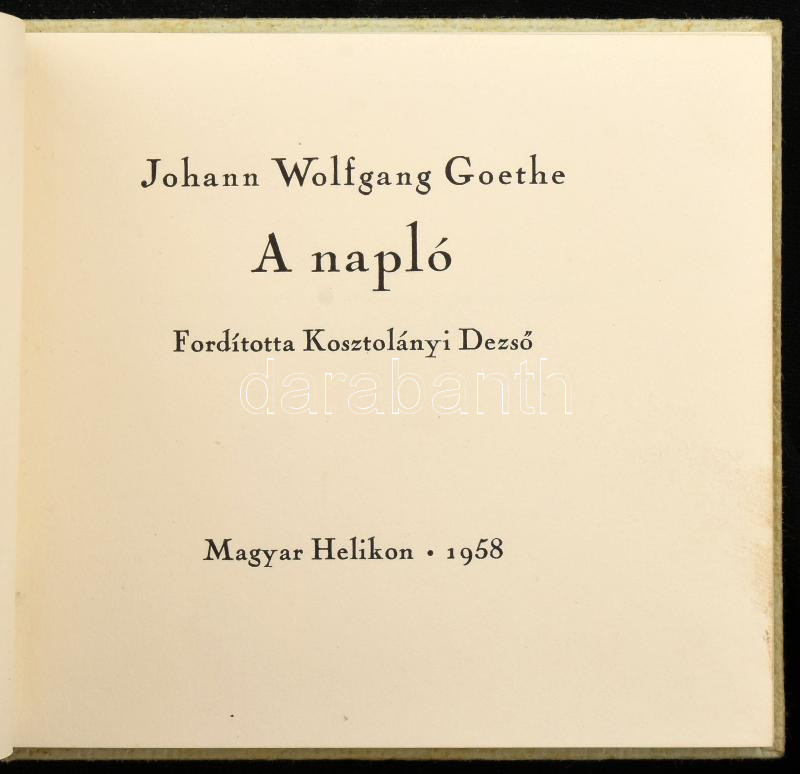 Goethe, Johann Wolfgang: A napló. Ford.: Kosztolányi Dezső. (Minikönyv... https://www.darabanth.com/de/448-Fernauktion/448.0/Bucher/Bucher-Minibucher~2000022/Goethe-Johann-Wolfgang-A-naplo-Ford-Kosztolanyi-Dezso-Minikonyv-Bp-1958-Magyar-Helik~II2966701