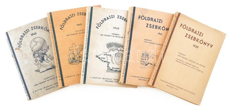 1939-1941-1944 Földrajzi Zsebkönyvek 5 kötete, 1939, 1941-1944. Bp., Magyar Földrajzi Társaság. Kiadói papírkötések, két kötetben (1942., 1944.) melléklettel is (Európa térképe az 1942. a - Földrajzi Zsebkönyvhöz, Magyarország kistérképei.) Kiadói papírkötések, foltos borítókkal.