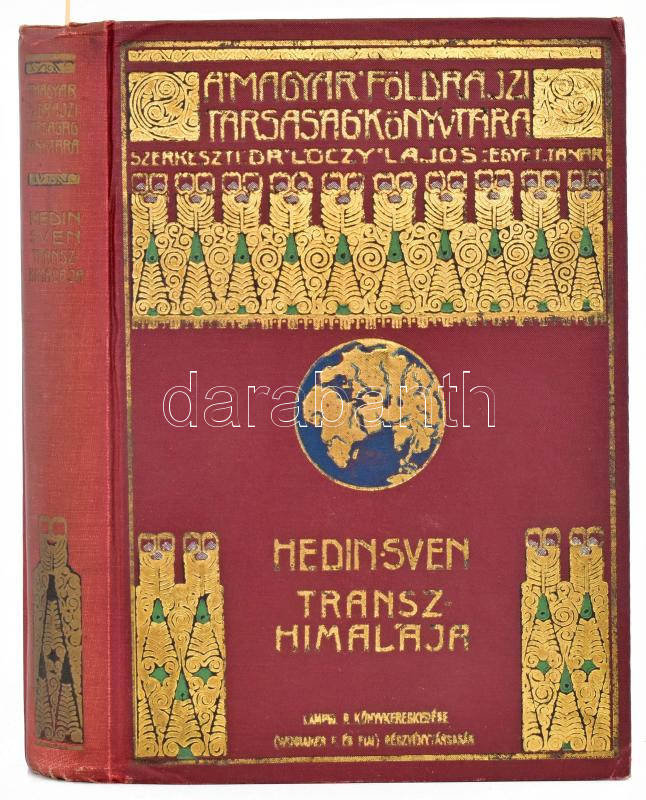 Hedin, Sven: Transzhimalája. Felfedezések és kalandok Tibetben. Ford.: Kondor Alfréd. Magyar Földrajzi Társaság Könyvtára. Bp., [1910], Lampel R. (Wodianer F. és Fiai), VI+330 p. + 42 (fekete-fehér képtáblák) t. + 1 (kihajtható térkép) t. Gazdag szövegközi és egészoldalas képanyaggal illusztrált. Kiadói gazdagon aranyozott egészvászon-sorozatkötésben, a borítón némi kopással, a színes képtáblák hiányoznak.