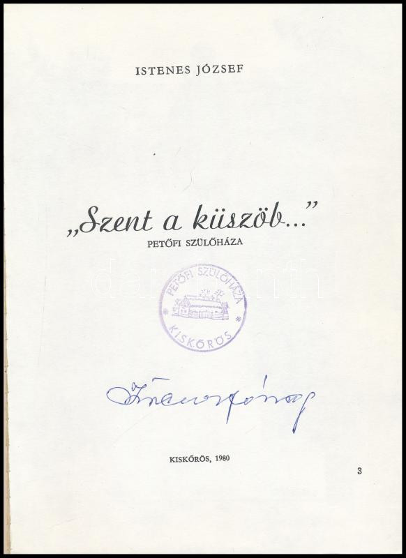 Istenes József: ,,Szent a küszöb..." Petőfi szülőháza. Kiskőrös, 1980, Katona József Múzeum. Hatodik, átdolgozott kiadás. Kiadói papírkötés. A szerző által aláírt példány, a címlapon "Petőfi szülőháza, Kiskőrös" bélyegzővel. + 2 db bélyegzővel ellátott képeslap (Petőfi és szülőháza)