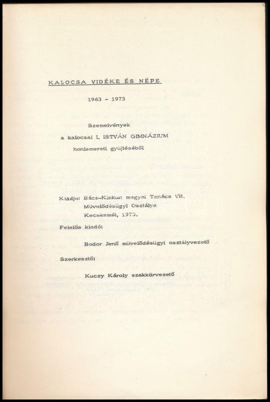 Kalocsa vidéke és népe. 1963-1973. Szemelvények a kalocsai I. István Gimnázium honismereti gyűjtéséből. Szerk.: Kuczy Károly. Kecskemét, 1973, Bács-Kiskun megyei Tanács VB Művelődésügyi Osztálya. Kiadói papírkötés, kissé kopott, sérült borítóval. Megjelent 2000 példányban.