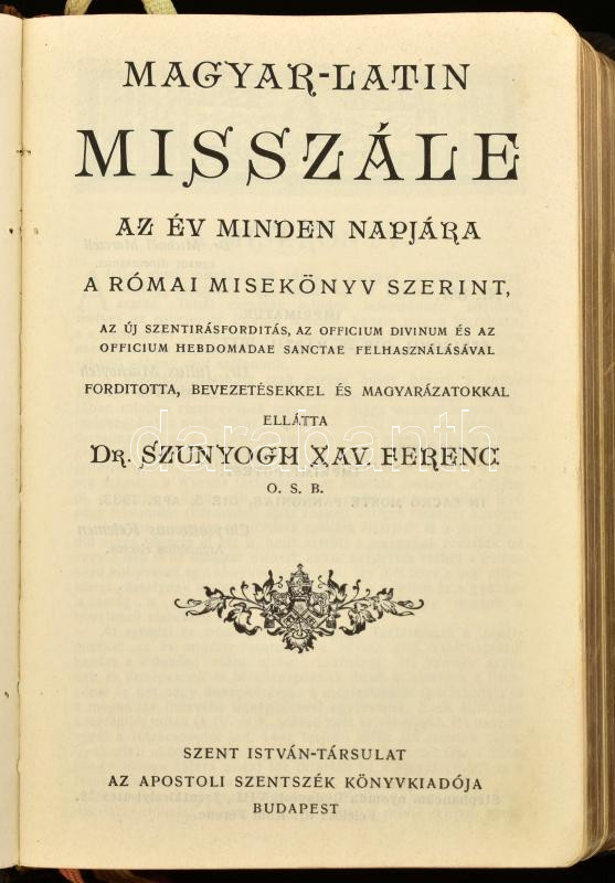 Újszövetségi Szentírás a Vulgata szerint. Káldi György S. J. fordítása nyomán, tekintettel az eredeti szövegre, átdolgozta, bevezetésekkel és jegyzetekkel ellátta a Szent István-Társulat Szentírás-Bizottsága. Bp., [1928], Szent István-Társulat, 675+(5) p. Kiadói egészvászon-kötés, aranyozott lapélekkel, ajándékozási bejegyzéssel. + Magyar-latin misszále az év minden napjára. A római misekönyv szerint fordította, bevezetéssel és magyarázatokkal ellátta Dr. Szunyogh Xav. Ferenc. Bp., [1933], Szent István-Társulat, 1488 p. Magyar és latin nyelven. Kiadói egészvászon-kötés, aranyozott lapélekkel, ajándékozási bejegyzéssel.