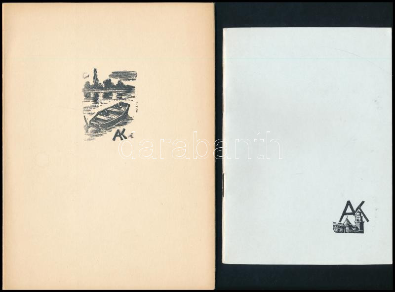 Andruskó Károly 2 db DEDIKÁLT ex libris kiadványa: Zentai exlibrisek. Zenta, 1969, szerzői kiadás ("Udarnik"-ny.), 2 sztl. lev.+32 p.+2 sztl. lev. (33 db egészoldalas reprodukcióval). Kiadói tűzött papírkötés. + A Tisza exlibriseken. Zenta, 1970, "Dudás Gyula" Múzeum- és Levéltárbarátok Köre, 2 sztl. lev.+20 p. (20 db egészoldalas reprodukcióval). Kiadói papírkötés. Számozott (271./500) példány. Mindkettő a művész, Andruskó Károly (1915-2008) által DEDIKÁLT.