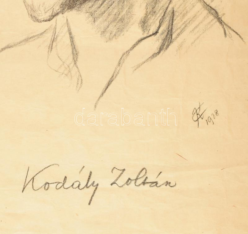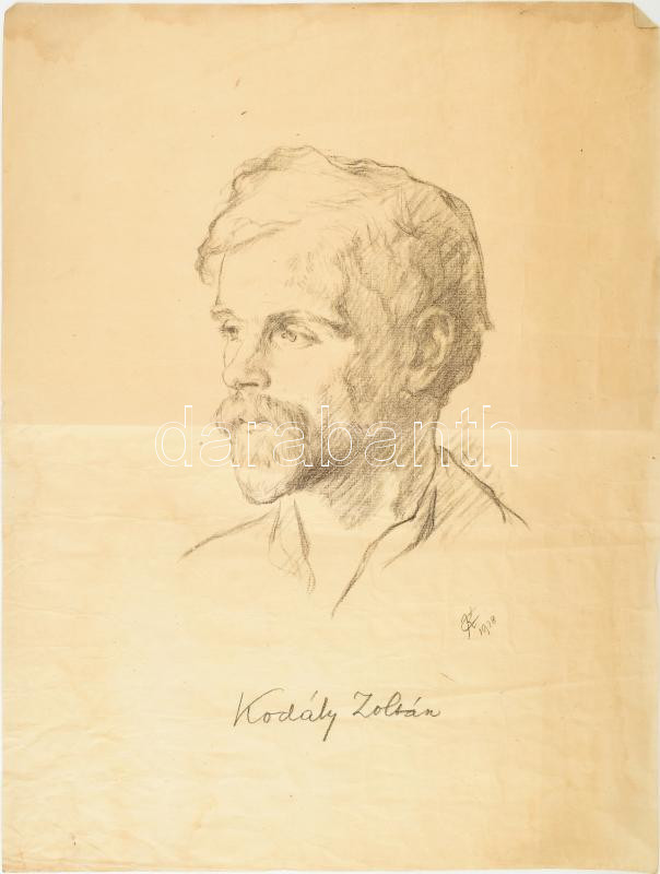 CK 1928 jelzéssel: Kodály Zoltán (1882-1967) zeneszerző, zenetudós, népzenekutató portréja. Ceruza, papír, jelzett, a lap gyűrött, kisebb ázásnyomokkal, 58,5x43 cm