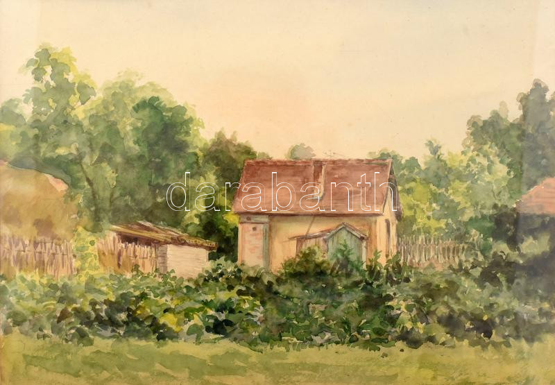 Jelzés nélkül: Kertek alján. Akvarell, papír, üvegezett fakeretben, 23... https://www.darabanth.com/de/448-Fernauktion/448.0/Gemalde-und-Grafiken/Gemalde-und-Graphic-quot-signiertquot-quot-ohne-Signquot-~1000002/Jelzes-nelkul-Kertek-aljan-Akvarell-papir-uvegezett-fakeretben-23-5C39733-5-cm~II2966417