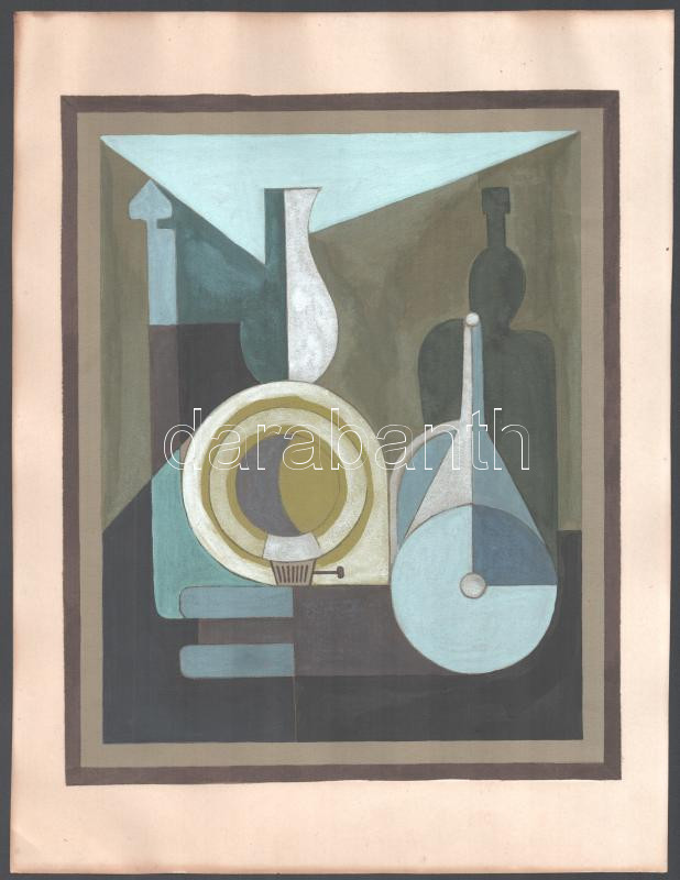 Beschreibung: Olvashatatlan jelzéssel (jobbra lent): Geometrikus csendélet. Akvarell, ceruza, papír. 24x19 cm