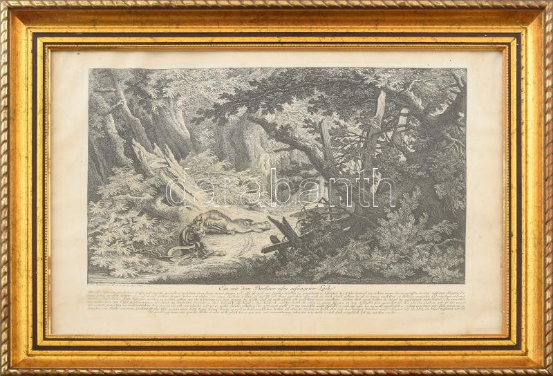 Johann Elias Ridinger (1698-1767): Hiúz elfogása csapdával (Ein mit dem Berliner eisen gefangener Luchs!), 1750 k.. Rézmetszet, papír, jelzett a metszeten. Foltos. Dekoratív, üvegezett fakeretben. 21x35 cm