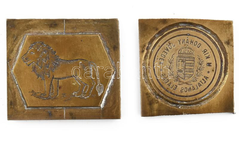 Beschreibung: 2 darab régi bronz nyomóforma, közte "Magyar Kir. Dohány Jövedék általános Eladás", 4x4, 4x4,5 cm