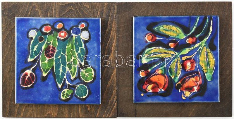 Beschreibung: 2 db Hévizi Éva zománckép Kerámia, zománc. 15x15 cm Fa alapon