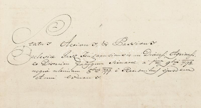 Beschreibung: 1799 Jászfényszaru, a plébánia latin nyelvű kimutatása, Rimanóczy Ferenc (1749-1821) nagyprépost aláírásával, viaszpecsétekkel