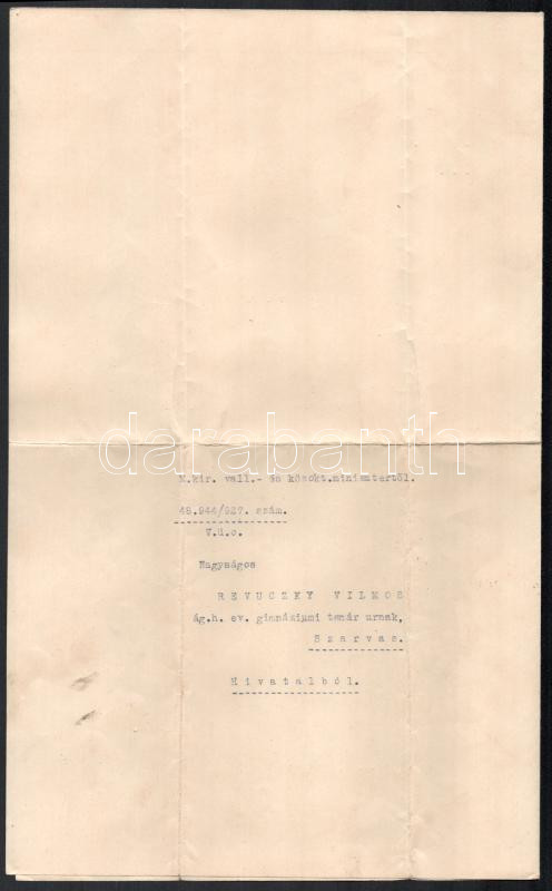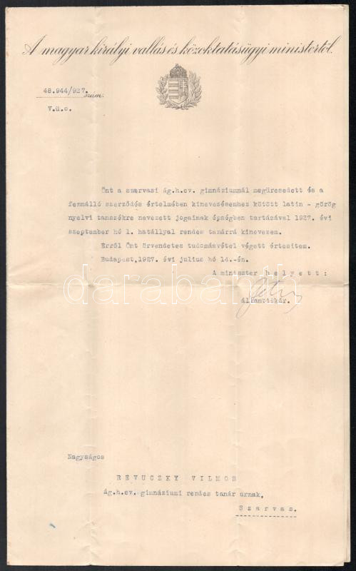 1927 Bp., gimnáziumi tanári kinevezés, Revuczky Vilmos, a szarvasi ág.... https://www.darabanth.com/de/448-Fernauktion/448.0/Kunst-Dokumente-andere-Sammelgebiete/Dokument~1000031/1927-Bp-gimnaziumi-tanari-kinevezes-Revuczky-Vilmos-a-szarvasi-ag-h-ev-gimnazium-tanara~II2972433