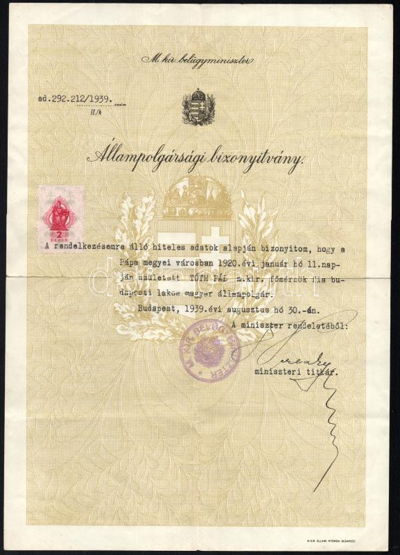 1939 Bp., állampolgársági bizonyítvány, 2P okmánybélyeggel https://www.darabanth.com/de/448-Fernauktion/448.0/Kunst-Dokumente-andere-Sammelgebiete/Dokument~1000031/1939-Bp-allampolgarsagi-bizonyitvany-2P-okmanybelyeggel~II2968305