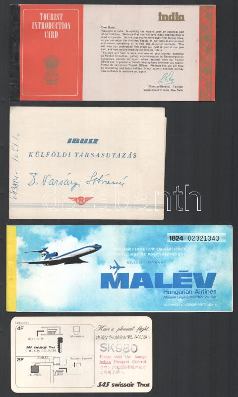 Beschreibung: 8 db magyar és külföldi utazási jegy, irat: IBUSZ, VOLÁN, MALÉV jegyek, BAT tájékoztató, indiai szeszesital-engedély turisták részére, stb.