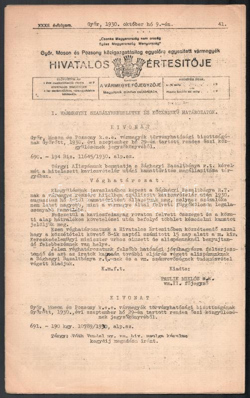 1930 Győr, Moson és Pozsony közigazgatásilag egyelőre egyesített vármegyék hivatalos értesítője, XXXII. évf. 41. sz., szerk.: Skultéty Miklós, kisebb szakadással