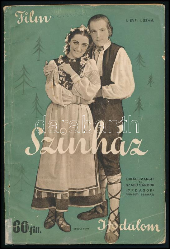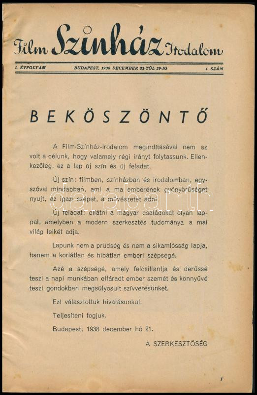 1938 Film, Színház, Irodalom I. évf. 1. sz. (induló szám), 1938. december 22-29. Bp., Athenaeum-ny., 128 p. Számos fekete-fehér fotóval, hirdetésekkel, keresztrejtvénnyel. Kiadói papírkötés, kissé foltos, sérült borítóval, néhány kissé foltos lappal.