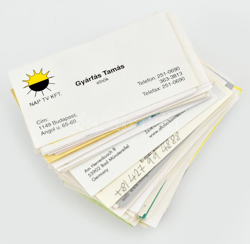 Modern névjegykártya tétel, kb. 100 db, közte vállalkozók, orvosok, Gy... https://www.darabanth.com/de/448-Fernauktion/448.0/Kunst-Dokumente-andere-Sammelgebiete/Drucksachen~2000005/Modern-nevjegykartya-tetel-kb-100-db-kozte-vallalkozok-orvosok-Gyarfas-Tamas-a-Nap-TV~II2891450