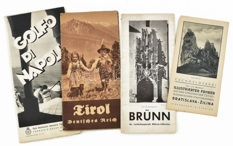 Beschreibung: cca 1930-1940 4 db külföldi idegenforgalmi ismertető prospektus: Bratislava-Zilina, Brünn (Brno), Tirol - Deutsches Reich, Golfo di Napoli