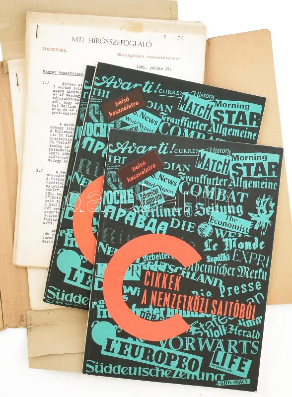 cca 1981-86 MTI Hírösszefoglaló és Cikkek a nemzetközi sajtóból össz. ... https://www.darabanth.com/de/448-Fernauktion/448.0/Kunst-Dokumente-andere-Sammelgebiete/Drucksachen~2000005/cca-1981-86-MTI-Hirosszefoglalo-es-Cikkek-a-nemzetkozi-sajtobol-ossz-6-db-szama~II2977469