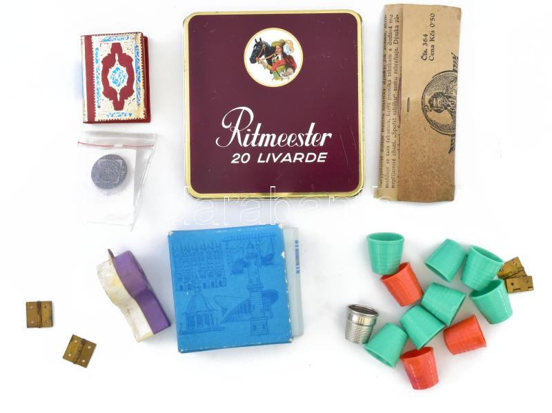 Beschreibung: Cigarettás dobozok, cigarettás papír, gyűszűk, zsanér vegyes bolhapiaci tétel.
