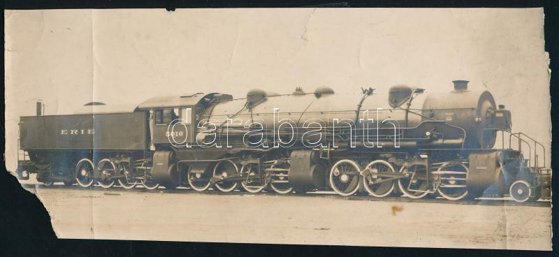1916 Az amerikai Baldwin Locomotive Works által épített Erie 5016 triplex gőzmozdony (össz. 3 db készült az Erie Railroad vasútvonal részére 1914 és 1916 között), fotó, szélein sérült, sarokhiánnyal, 21,5x9,5 cm / 1916 Erie No. 5016 triplex locomotive, constructed by the American Baldwin Locomotive Works (only 3 of this type were built for the Erie Railroad between 1914 and 1916), photo, damaged edges, missing corner, 21.5x9.5 cm