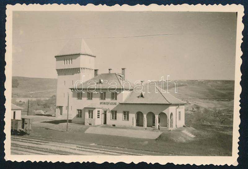 Beschreibung: 1940 Monorfalva (Erdély), vasútállomás, hátoldalon feliratozott fotó, 6×9 cm