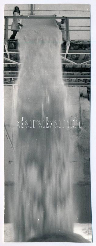 Beschreibung: 1970 "Cukorzuhatag" a Szolnoki Cukorgyárban, sajtófotó, a hátoldalon feliratozott, pecséttel jelzett, körbevágott, 17x6 cm