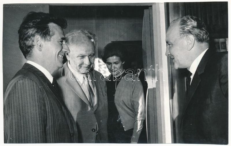 Beschreibung: 1970 Louis Aragon és Roland Leroy francia kommunisták Kádár Jánossal, sajtófotó, a hátoldalon feliratozott, pecséttel jelzett, 15,5x9,5 cm