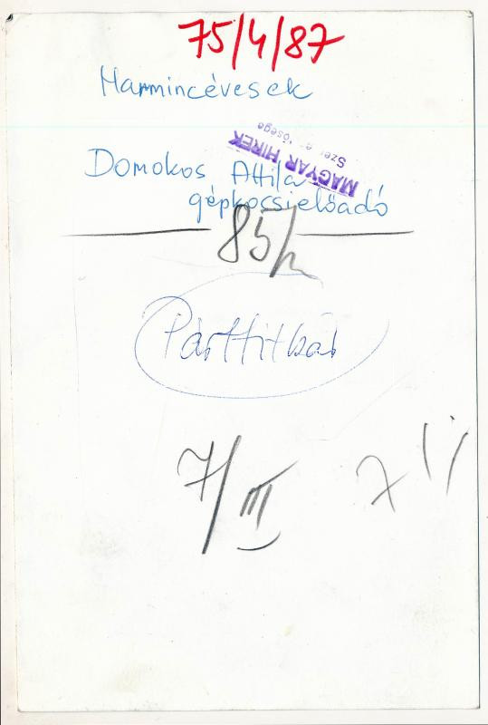1975 "Harmincévesek - Domokos Attila gépkocsi előadó", sajtó... https://www.darabanth.com/de/448-Fernauktion/448.0/Kunst-Dokumente-andere-Sammelgebiete/Foto~2000027/1975-Harmincevesek-Domokos-Attila-gepkocsi-eloado-sajtofoto-a-hatoldalon-feliratozott-~II2938658