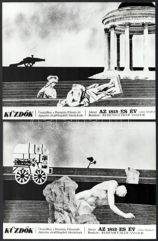 Beschreibung: cca 1972 ,,Az 1812-es év" cÃmű kollázs-animációs rövid film Jan Lenica, Walerian Borowczyk és Kovásznai György által készÃtett kollázsokra épült, 4 db vintage produkciós filmfotó ezüst zselatinos fotópapÃron, a használatból eredÅ‘ (esetleges) kisebb hibákkal, 18x24 cm