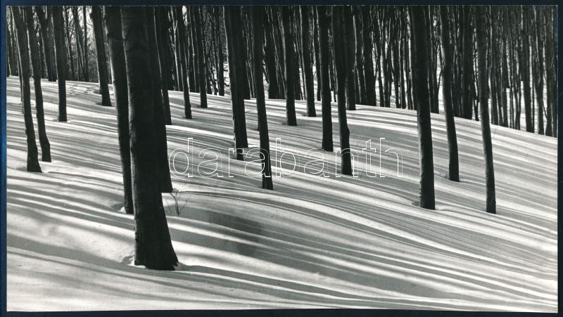 Beschreibung: cca 1975 Kriss Géza (?-?) budapesti fotóművész aláírt vintage fotóművészeti alkotása (Téli táj), ezüst zselatinos fotópapíron, 13,5x24,1 cm