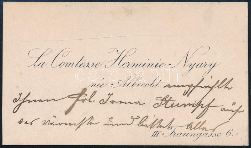 1884 Nyáry Hermine (1856-1929) grófnő szül. Albrecht, színésznő autográf német nyelvű ajánló sorai saját névjegykártyáján. Férje gróf Nyáry Tamás (1839-1902). / Autograph lines in German by Countess Hermine Nyáry born Albrecht (1856-1929) on her own business card, with the adress Traungasse in Vienna.