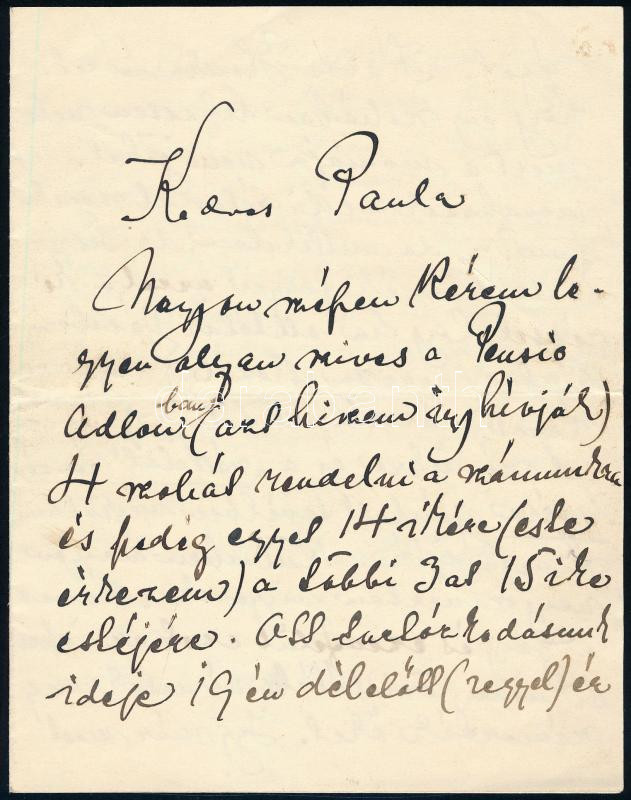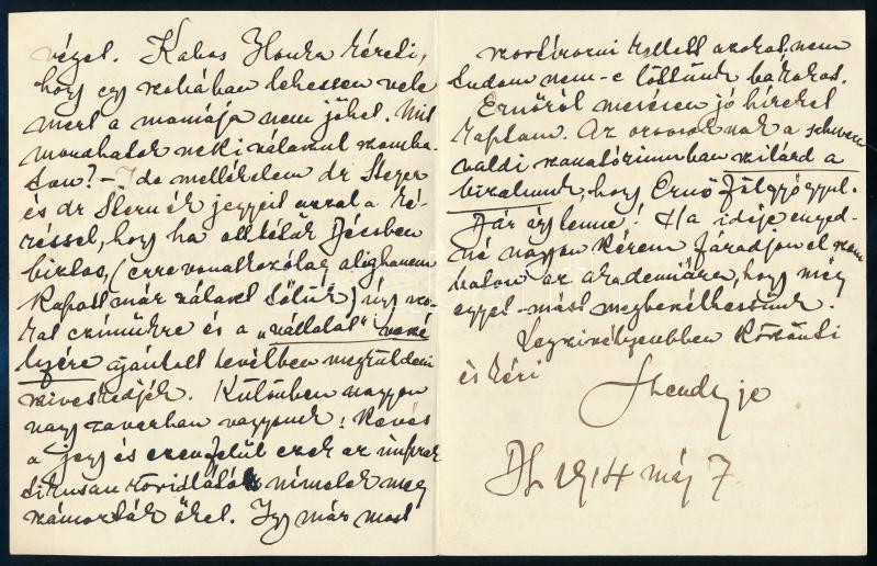 1914 Szendy Árpád (1863-1922) zongoraművész és - tanár, zeneszerző által saját kezűleg írt levele, tanítványa, egykori asszisztense, Braun Paula (1881-1962) zongoraművész, pedagógus részére, aláírással, 3 beírt oldal.